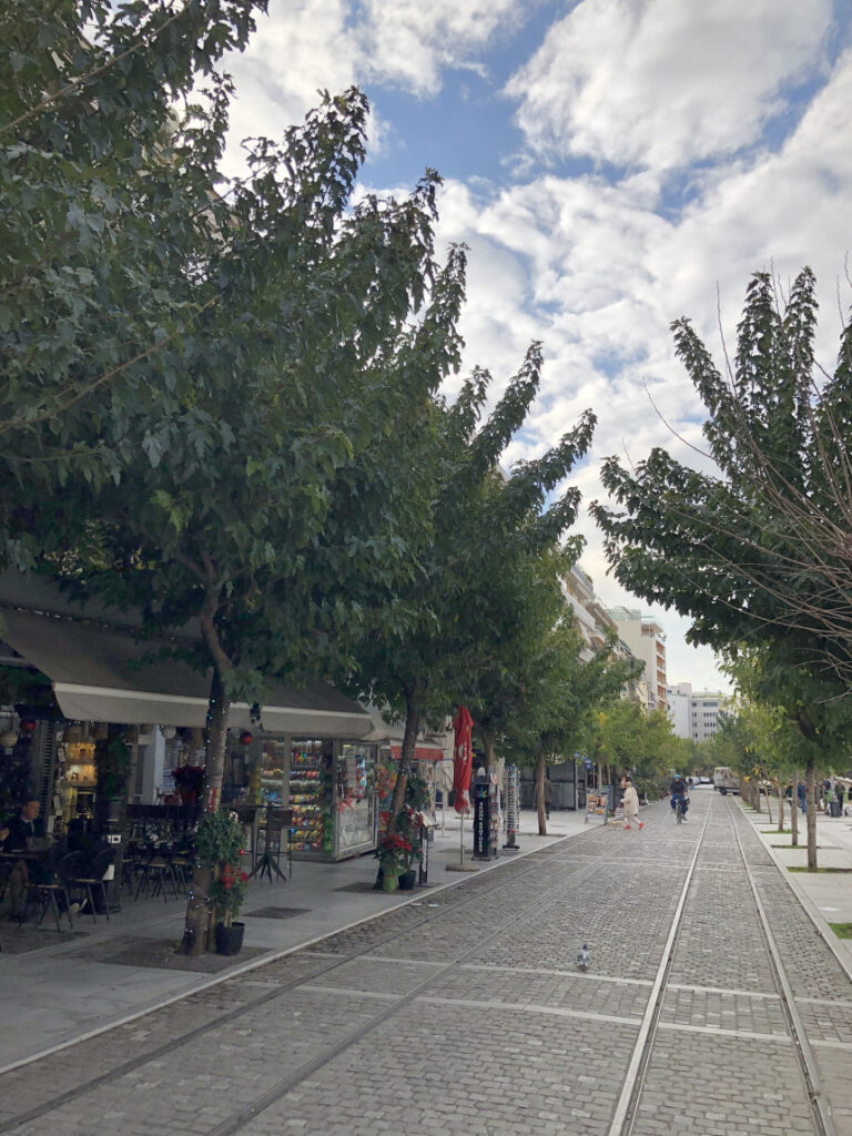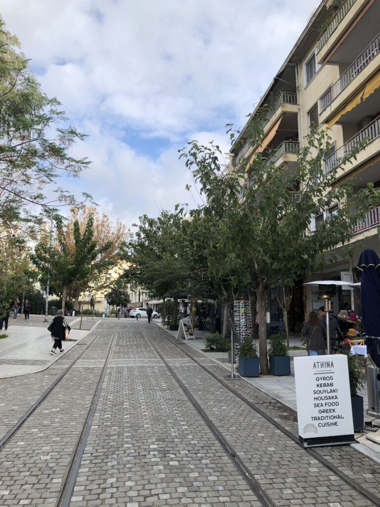 Προχωρώντας, ο πεζόδρομος μπροστά μας αποκαλύπτει μια γραφική εικόνα. Οι ράγες του Τραμ, ενσωματωμένες στο λιθόστρωτο, δημιουργούν μια ευθεία γραμμή που οδηγεί το βλέμμα μακριά. Δεξιά και αριστερά, τα ψηλά δέντρα (ακόμα με αρκετό φύλλωμα) προσφέρουν μια πινελιά πράσινου, ενώ οι παλιές πολυκατοικίες «παρακολουθούν». Η ατμόσφαιρα είναι ευχάριστη κάτω από τον μερικώς συννεφιασμένο ουρανό.