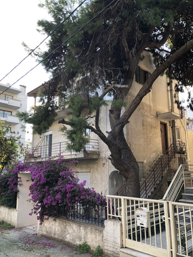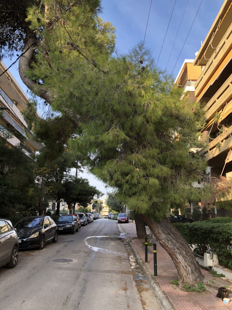 Τα πεύκα, επιβλητικά και μερικές φορές «επαναστατικά», γέρνουν πάνω από το οδόστρωμα, δημιουργώντας φυσικές αψίδες που αγκαλιάζουν τα κτίρια και τους περαστικούς. Είναι δέντρα που μοιάζουν να έχουν μεγαλώσει μαζί με τους ανθρώπους της γειτονιάς, διεκδικώντας τον δικό τους χώρο στον αστικό ιστό. Περπατώντας, βλέπεις την εξέλιξη της Αθήνας σε λίγα μόλις μέτρα: Μονοκατοικίες με κεραμίδια, λευκές προσόψεις και αυλές γεμάτες παπύρους και οργιώδεις βουκαμβίλιες.
