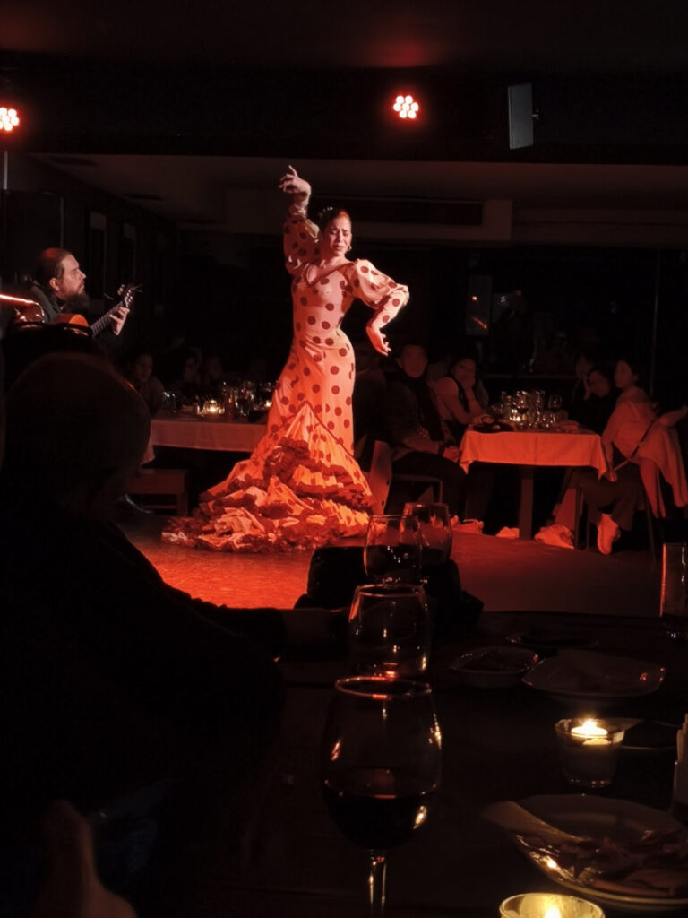 Μέσα στο ημίφως, η μυρωδιά από παλαιωμένο ξύλο και κόκκινο κρασί σε προδιαθέτει για κάτι παραπάνω από μια απλή παράσταση. Είναι μια ιεροτελεστία. Ο κιθαρίστας παίρνει τη θέση του στη σκιά. Οι πρώτες νότες είναι αργές, σχεδόν παραπονιάρικες. Ξαφνικά, η σκηνή λούζεται στο πορτοκαλί φως. Η χορεύτρια εμφανίζεται με το κόκκινο πουά φόρεμα (traje de flamenca). Κάθε κίνησή της είναι μια δήλωση. Το χτύπημα των τακουνιών της στο παρκέ δεν είναι απλός ρυθμός· είναι ο χτύπος μιας καρδιάς που διψά για ζωή.