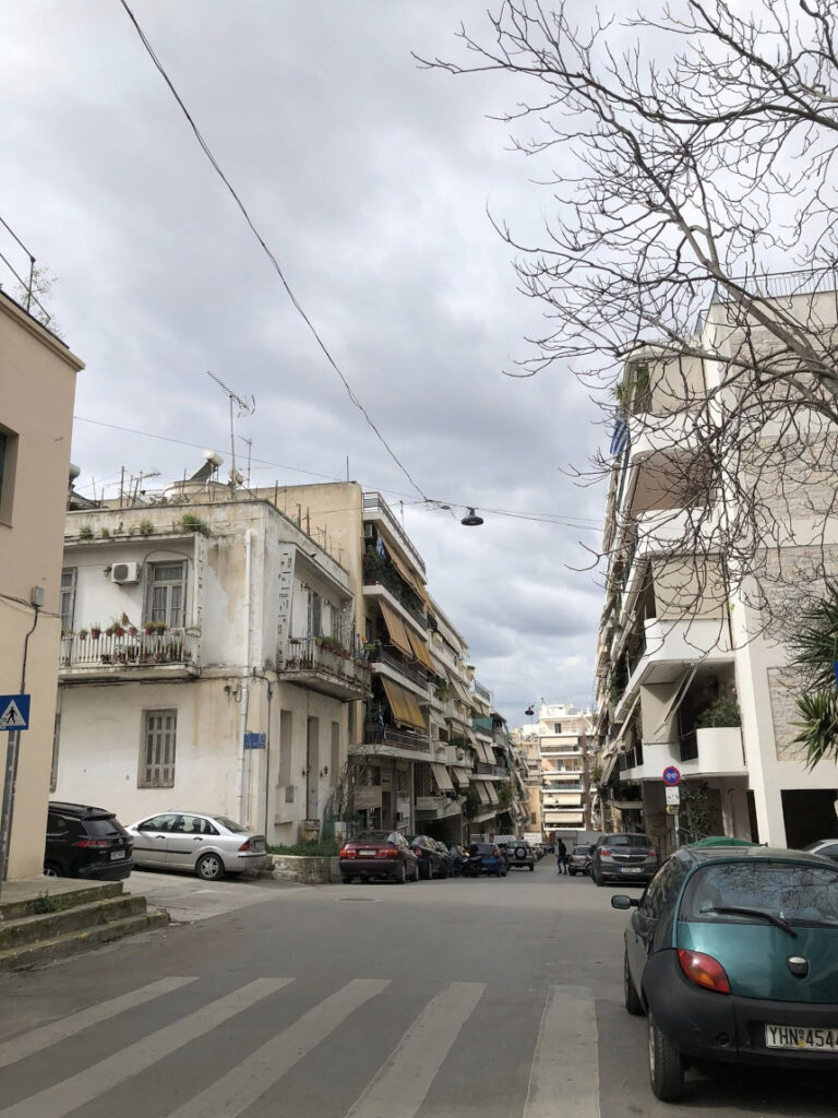 Τα γυμνά κλαδιά των δέντρων κόντρα στον συννεφιασμένο ουρανό δημιουργούν μια μελαγχολική αλλά πανέμορφη γεωμετρία, ενώ οι ανθισμένες γλάστρες στα μπαλκόνια δίνουν το «σύνθημα» πως η Άνοιξη είναι ήδη εδώ και περιμένει τη σειρά της. Τα σταθμευμένα αυτοκίνητα, οι πινακίδες, η ησυχία του δρόμου πριν την είσοδο του Μαρτίου. Μια γειτονιά που ζει, αναπνέει και μεταμορφώνεται.