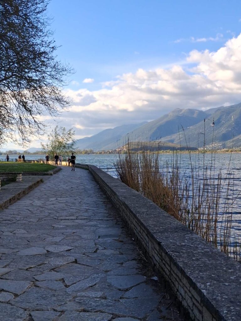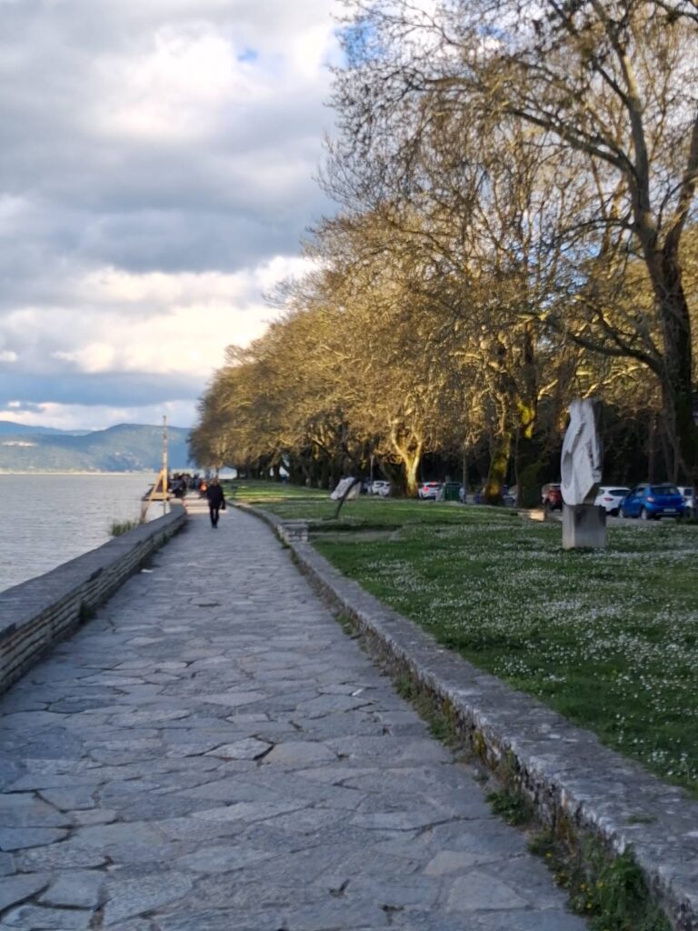 Όπως και στην Καστοριά, έτσι και εδώ στα Γιάννενα, η διαδρομή δίπλα στο νερό είναι υποδειγματικά προσεγμένη. Το πέτρινο πλακόστρωτο, τα αιωνόβια πλατάνια που “αγκαλιάζουν” το δρόμο και η ηρεμία του τοπίου δημιουργούν ένα σκηνικό ασφάλειας και ομορφιάς. Είναι ο ιδανικός τόπος για Ρομαντικούς περιπάτους την ώρα που το φως του ήλιου παίζει με τα σύννεφα.