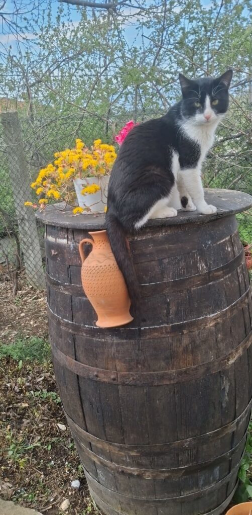 Με φόντο το πήλινο αμφορέα και τα κίτρινα άνθη, μας υπενθυμίζει ότι η ομορφιά ενός κήπου ολοκληρώνεται μόνο όταν συνυπάρχει αρμονικά με την αγάπη για τα ζώα.