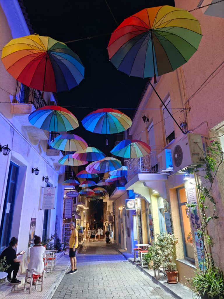 Η διακόσμηση με πολύχρωμες ομπρέλες που κρέμονται στον αέρα, όπως αυτή στην Αίγινα στη φωτογραφία μας, ξεκίνησε και έγινε ευρέως γνωστή, από το Umbrella Sky Project στην πόλη Águeda της Πορτογαλίας το 2011. Το συγκεκριμένο project ήταν μέρος ενός καλλιτεχνικού φεστιβάλ (AgitÁgueda Art Festival), και η ιδέα ήταν να δημιουργηθεί σκιά στους δρόμους το καλοκαίρι, με έναν καλλιτεχνικό και εντυπωσιακό τρόπο. Οι εικόνες από εκείνον τον πεζόδρομο έγιναν viral και το concept γρήγορα εξαπλώθηκε σε όλο τον κόσμο — σε πόλεις, τουριστικούς προορισμούς, καταστήματα, και φεστιβάλ.
