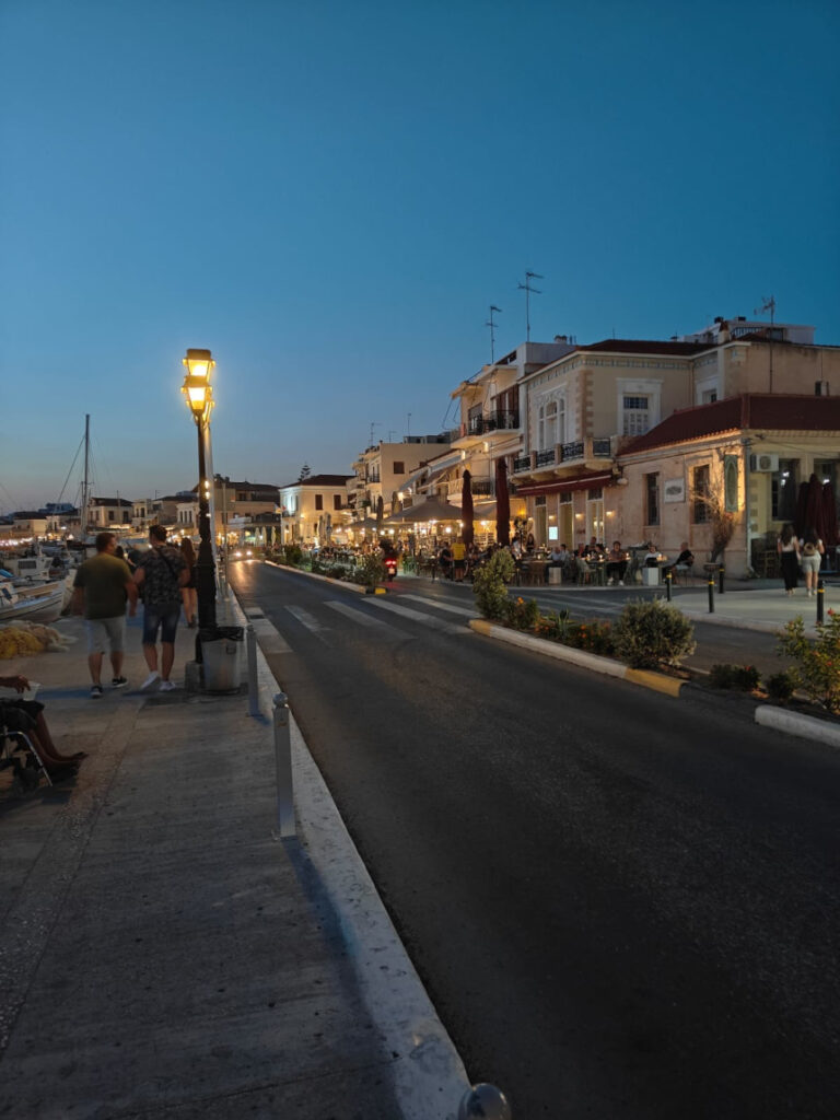 Καθώς ο ήλιος δύει στον ορίζοντα, βάφοντας τον ουρανό με αποχρώσεις του πορτοκαλί, του ροζ και του μπλε, η Αίγινα μεταμορφώνεται. Η νύχτα φέρνει μαζί της μια διαφορετική ατμόσφαιρα, ένα μείγμα ζωηράδας και γαλήνης που μαγεύει τον επισκέπτη. Το λιμάνι, καρδιά του νησιού, παραμένει ζωντανό. Μεγαλόπρεπα πλοία, λουσμένα με τα φώτα τους, δεσπόζουν στην προκυμαία, έτοιμα να σαλπάρουν ή μόλις έχουν δέσει, μεταφέροντας ταξιδιώτες και τοπικά προϊόντα.