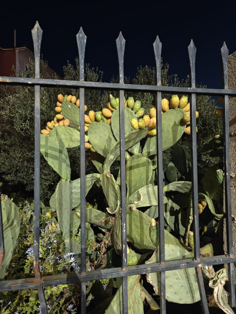 Τα φραγκόσυκα είναι ώριμα, με τα περισσότερα να έχουν πάρει ένα κιτρινοπορτοκαλί χρώμα. Αυτό είναι σύνηθες για αυτή την εποχή στην Ελλάδα, καθώς τα φραγκόσυκα ωριμάζουν συνήθως από τον Αύγουστο έως τον Οκτώβριο. Είναι γνωστό ότι αποτελούν ένα δημοφιλές, γλυκό και δροσιστικό φρούτο του καλοκαιριού. Οι φυτικές ίνες, μαζί με την πηκτίνη που περιέχουν, βοηθούν στην καλή λειτουργία του πεπτικού συστήματος και μπορούν να συμβάλουν στη μείωση των επιπέδων γλυκόζης στο αίμα.