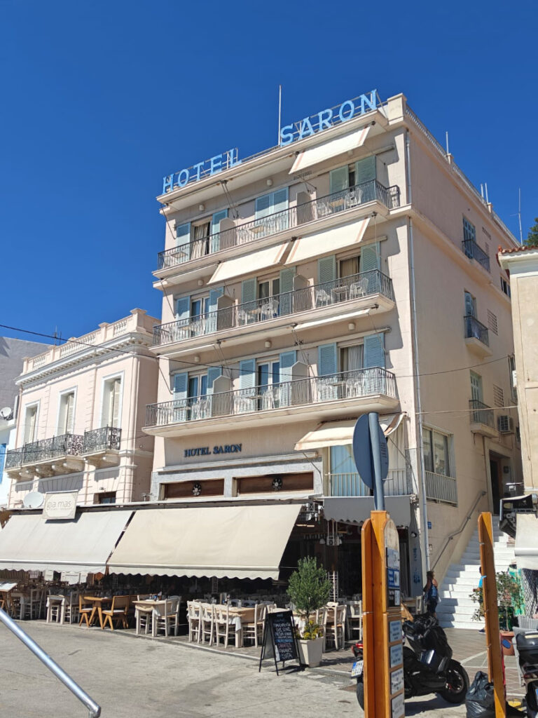 Επίσης, το νησί προσφέρει παραλίες με καταγάλανα νερά και πλούσια βλάστηση. Κάποιες από τις πιο γνωστές είναι το Λιμανάκι της Αγάπης, το Μοναστήρι και το Ασκέλι. Για τη διαμονή σας, το Hotel Saron, το οποίο φαίνεται εδώ, είναι ένα 3άστερο κατάλυμα που βρίσκεται στο κέντρο της πόλης, απέναντι από την αποβάθρα των Flying Dolphins. Προσφέρει δωμάτια με θέα στη θάλασσα και παροχές όπως κλιματισμό και δωρεάν Wi-Fi.