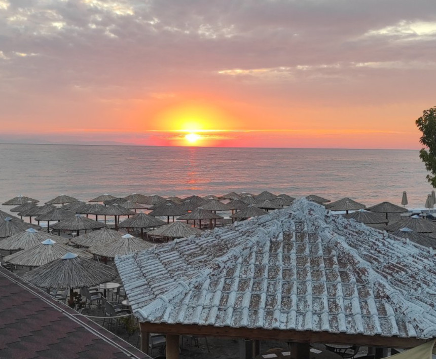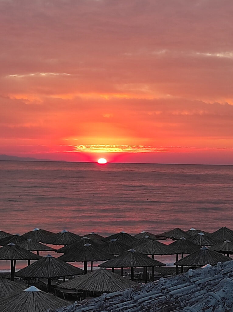 Μια υπέροχη ανατολή του ηλίου διαγράφεται στον ορίζοντα, με τον ήλιο να αναδύεται πάνω από τη θάλασσα και να βάφει τον ουρανό σε έντονες αποχρώσεις του κόκκινου και του πορτοκαλί. Οι ζεστές αυτές αντανακλάσεις απλώνονται πάνω στην ήρεμη επιφάνεια του νερού. Στο κάτω μέρος της εικόνας, οι ψάθινες ομπρέλες της παραλίας, δημιουργούν μια αίσθηση ηρεμίας και ένα ειδυλλιακό σκηνικό για το ξεκίνημα της μέρας στους πρόποδες του Ολύμπου, που ονομάζεται Παραλία Παντελεήμονα. Η παραλία αυτή βρίσκεται ακριβώς κάτω από το Κάστρο του Πλαταμώνα και έχει μήκος περίπου 3 χιλιόμετρα. Βραβεύεται συχνά με τη Γαλάζια Σημαία για την καθαρότητα των νερών της.