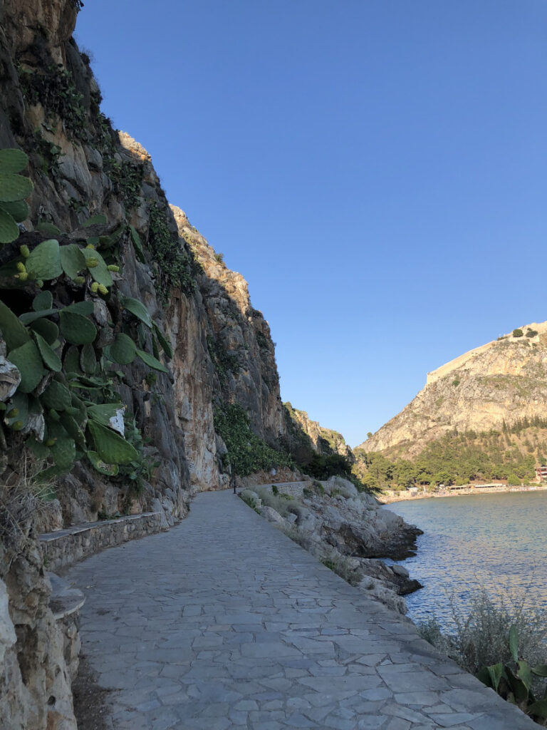 Αυτό το αρχικό εμπόδιο, ωστόσο, δεν είναι μόνιμο, καθώς με προσοχή ο δρόμος είναι προσβάσιμος και προσκαλεί σε μια εξερεύνηση. Δίπλα στον πεζόδρομο, ο βράχος της Ακροναυπλίας υψώνεται επιβλητικός, σκεπασμένος με φραγκοσυκιές και άλλα φυτά που προσθέτουν μια άγρια, μεσογειακή πινελιά. Συνεχίζοντας το περπάτημα, ο πεζόδρομος, στρωμένος με πέτρινες πλάκες, μας οδηγεί παράλληλα με τη θάλασσα.