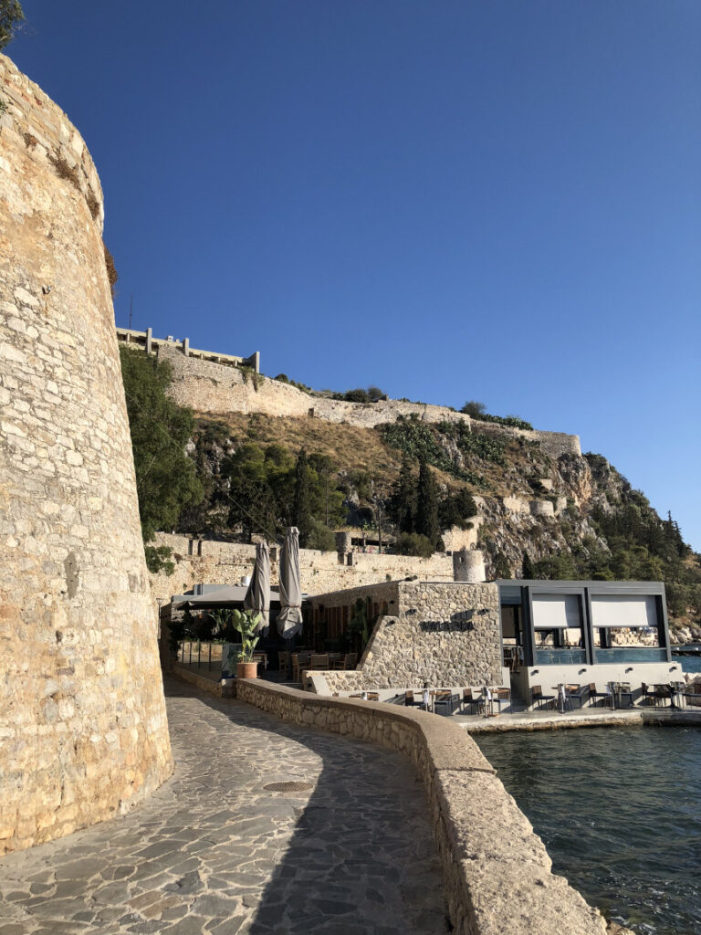 Το τέλος της διαδρομής μας είναι τόσο εντυπωσιακό όσο και η αρχή. Ο πεζόδρομος συνεχίζει να αγκαλιάζει τον βράχο, ενώ ψηλά, η παλιά οχύρωση και τα ερείπια του κάστρου της Ακροναυπλίας δεσπόζουν, ατενίζοντας τη θάλασσα. Μέσα από το φως του απογεύματος, η οχύρωση μοιάζει να φυλάει το Ναύπλιο, δίνοντας μια αίσθηση διαχρονικής προστασίας.
