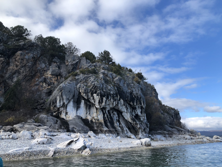 Μικρές κατασκευές, χτισμένες μέσα σε σπηλιές και σχισμές του βράχου, φαντάζουν απρόσιτες και επιβλητικές. Και μετά, έρχονται οι Βραχογραφίες: τοιχογραφίες που χρονολογούνται από τον 14ο αιώνα, ζωγραφισμένες πάνω στον βράχο, σε σημεία που μόνο από τη λίμνη μπορείς να προσεγγίσεις. Βλέπεις την τέχνη να αντιστέκεται στον χρόνο, με τη λίμνη να λειτουργεί ως φύλακας.