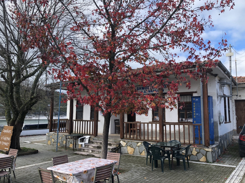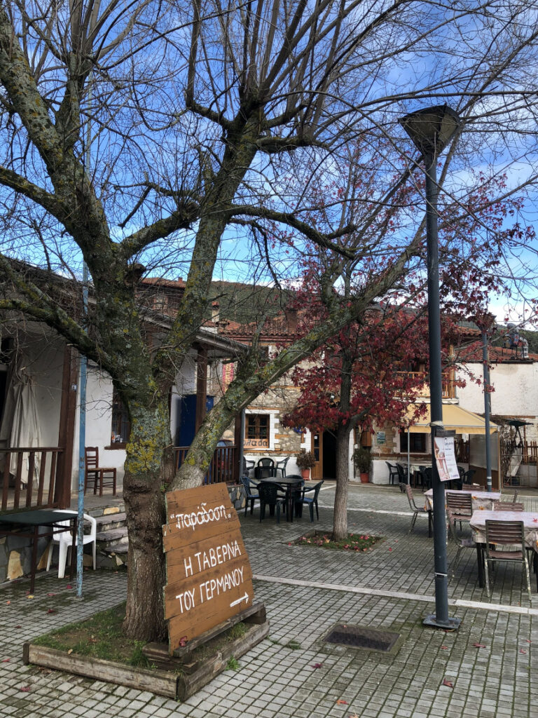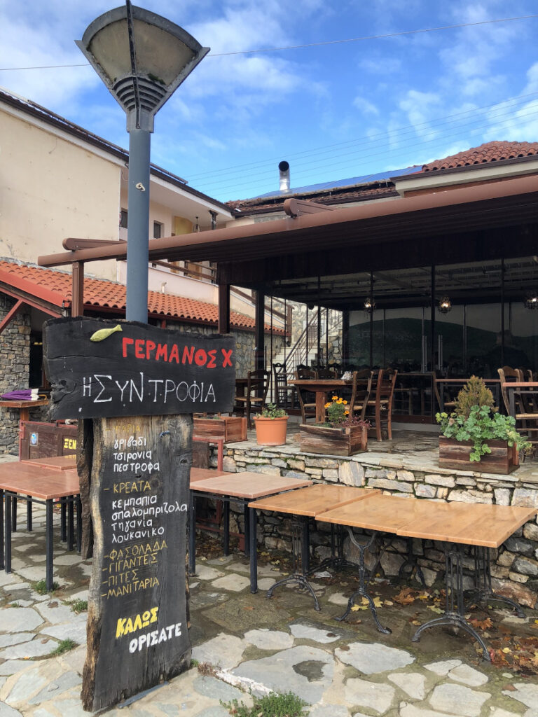 Οι παραδοσιακές πετρόκτιστες ταβέρνες, με τη χαρακτηριστική αρχιτεκτονική τους και τη χρονολογία «1909» χαραγμένη σε κάποιους τοίχους, μαρτυρούν μια ζωή αιώνων που δονείται ακόμα. Σε κάθε βήμα, η μυρωδιά του καπνού από τα τζάκια αναμειγνύεται με την υπόσχεση της γης: τα φημισμένα φασόλια και τα ψάρια της λίμνης. Στο κέντρο αυτής της ατμόσφαιρας βρίσκεται το κλασικό σημείο συνάντησης, όπως το είδατε και εμείς: «Η Συντροφιά» του Γερμανού.